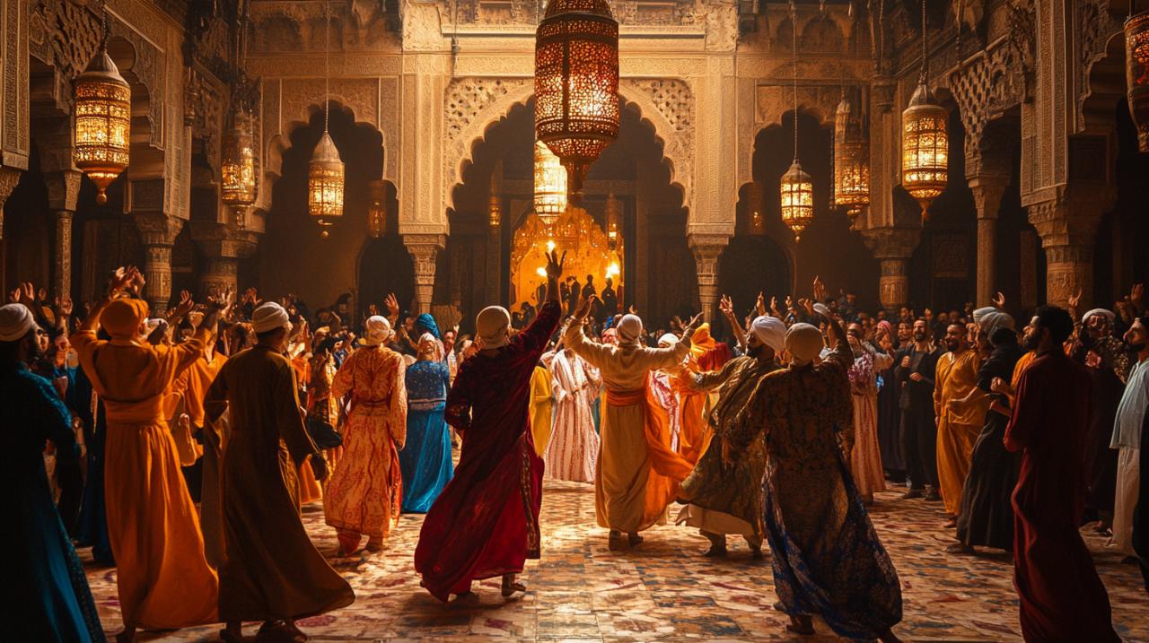 La música constituye el alma de cualquier celebración marroquí, y las bodas no son la excepción. A lo largo de la velada, diferentes grupos musicales interpretan estilos tradicionales que varían según la región de origen de la familia. Entre los géneros más populares se encuentran el Xaavi, característico de las bodas en el norte, la Dakka Marrachia de Marrakech con sus potentes tambores, el refinado Tarab Andalussi que evoca la herencia andaluza, los hipnóticos ritmos Gnawa con sus instrumentos de percusión, y las melodías espirituales de E3sawa y Hamacha. Los músicos no solo tocan, sino que animan constantemente a los invitados a unirse a la danza. Uno de los momentos culminantes es el dikka, una danza tradicional donde la pareja baila frente a sus familias reunidas mientras los invitados forman un círculo a su alrededor. Las mujeres ejecutan movimientos ondulantes característicos de la danza oriental, mientras los hombres realizan pasos más enérgicos. La música y el baile continúan durante horas, creando una atmósfera de celebración colectiva donde todos participan en la alegría de los novios.